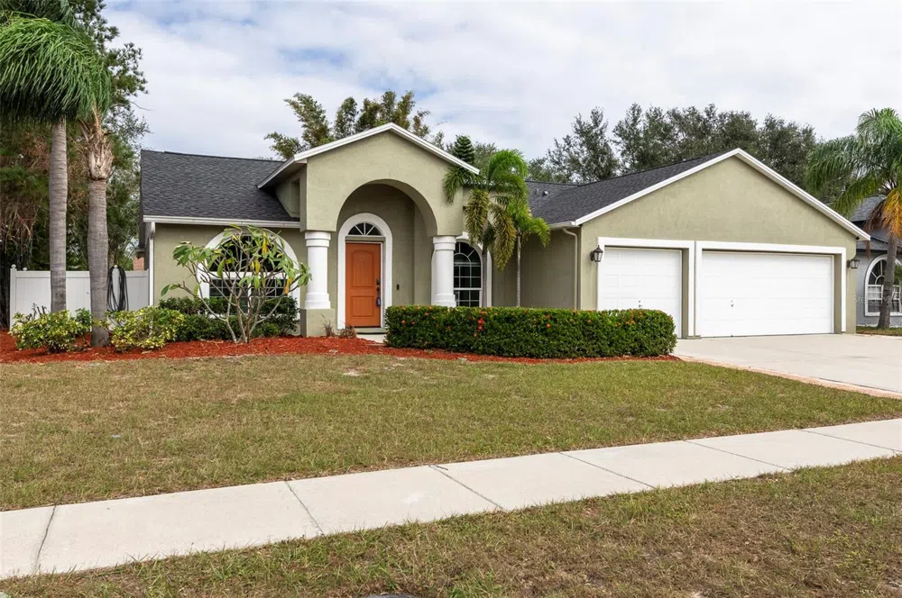Step into your private oasis in this freshly painted, move-in-ready pool home situated on a quarter-acre corner lot with a roof installed in 2021 and A BRAND NEW AC. This retreat combines style and functionality with four bedrooms, two bathrooms, a bonus den, and a thoughtful split-bedroom layout for seamless living. Luxury vinyl plank flooring, vaulted ceilings, and abundant natural light create a welcoming atmosphere, while the renovated kitchen—complete with granite countertops and stainless steel appliances—adds ease to both family dinners and entertaining. The primary suite is a highlight, featuring a spacious walk-in closet, pool access, and a private bathroom designed for relaxation, with a garden soaking tub and an oversized shower. A versatile front den provides the perfect home office, media room, or lounge space. Outdoors, the backyard offers a perfect retreat experience. Enjoy the pebble-tech finished pool and spa with color-changing LED pool light (app-controlled) and privacy screens, which are ideal for relaxing swims or evening soaks. The pool comes with The Clear Comfort System (a 5K system) which oxidizes the water to require minimal chemicals, a pool guy's dream! A covered patio invites outdoor dining and has 4 x 1500w mounted patio heaters while the expansive fenced yard provides seclusion and space for family activities. For car enthusiasts, the three-car garage includes ample storage and an EV charger, and a tankless water heater. This home also features a professionally installed Simply Safe Alarm System for the new owner's peace of mind. Located just 7 minutes from I-75, 26 miles to MacDill AFB, and within easy reach of Disney, this home perfectly combines convenience with luxury. With low community fees, no CDD, and the added benefit of not being in a flood zone, along with nearby top-rated schools, shopping, and recreation, this is where everyday living meets elevated style.